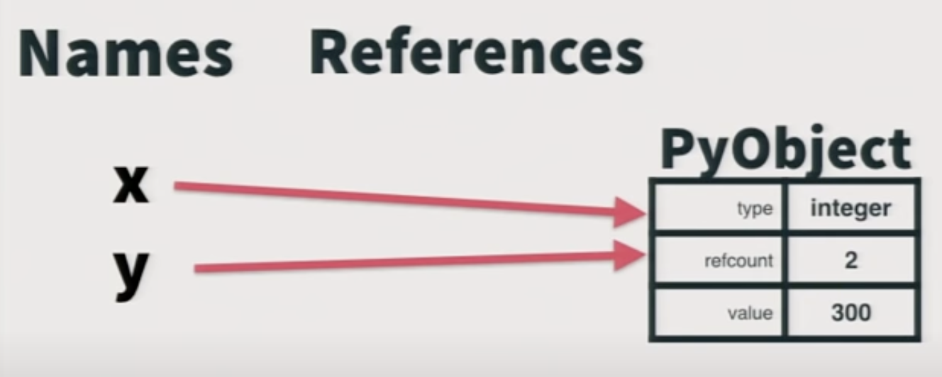 x = 300 # 불변 300 이라는 값을 x가 가리킴 (call by value), Ref count 1 y = 300 # 불변 300 이라는 값을 y가 가리킴 (call by value), Ref count 2 z = [300, 300] # z 배열 안에 300은 300 값을 가리킴 (call by value), Ref count 4 del x # Ref count 3 300이라는 값은 살아있음 y = None #Ref count 2 300이라는 값은 살아있음 z = None #Ref count 0 300이라는 값을 가리키는 ref가 없기 때문에 #300값이 할당된 메모리 회수